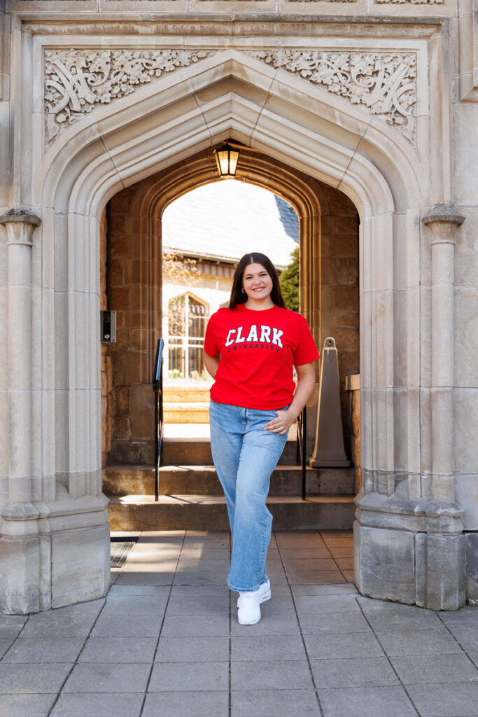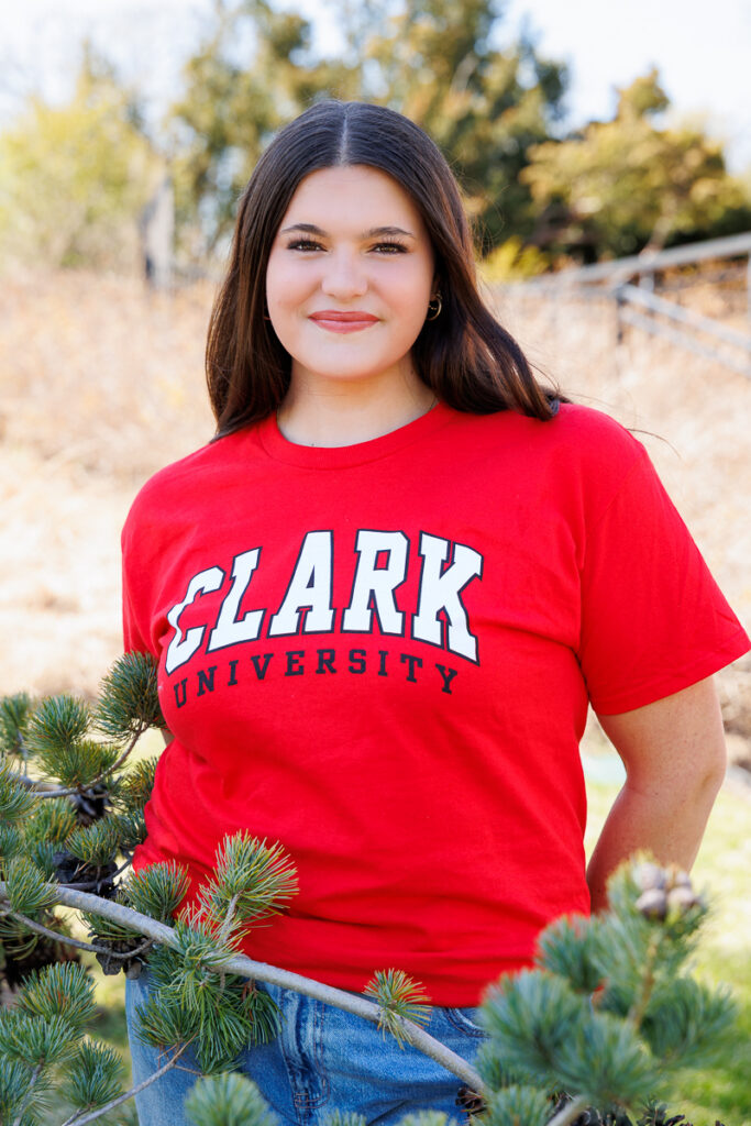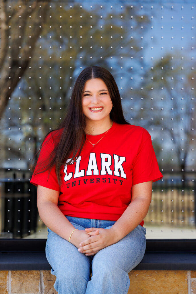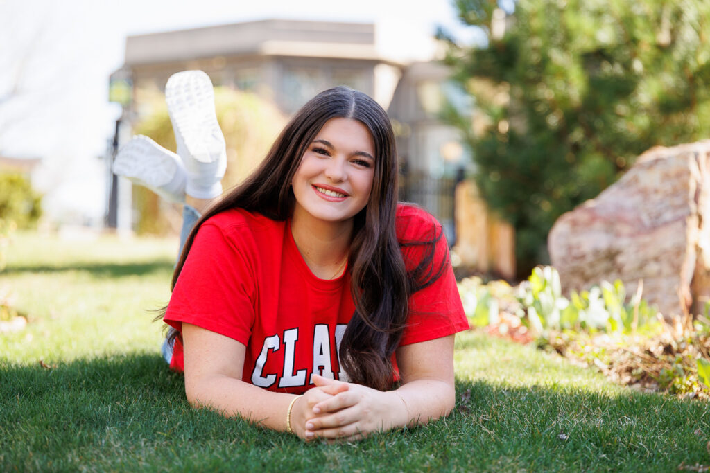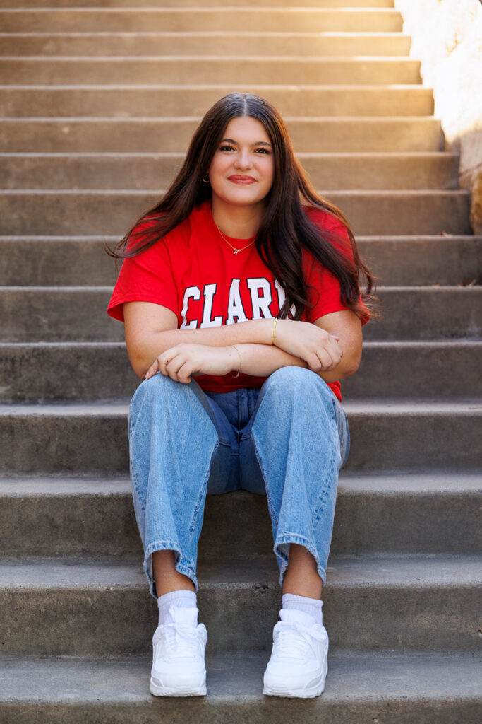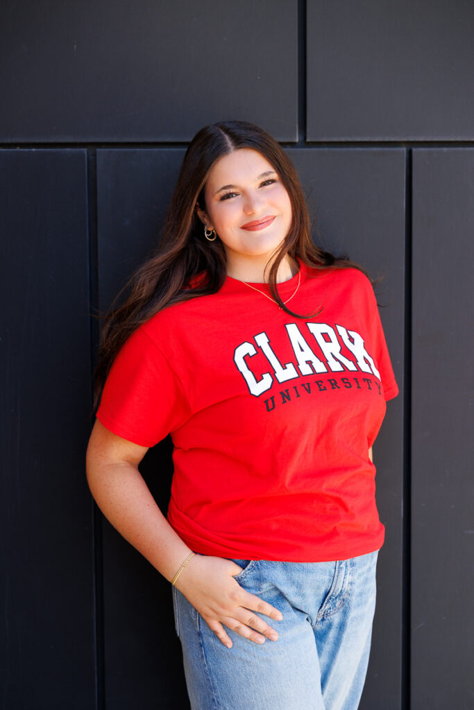 Wearing her college t-shirt kept her images simple, relaxed, and beautifully herself, with a look ahead to what’s next. In a few short months, she’ll be heading to Clark University to continue both her education and her softball career, and this session felt like the perfect way to pause and celebrate the in-between. Wearing her Clark shirt wasn’t just about school spirit. It was a quiet, confident nod to where she’s going and everything she has worked so hard for.